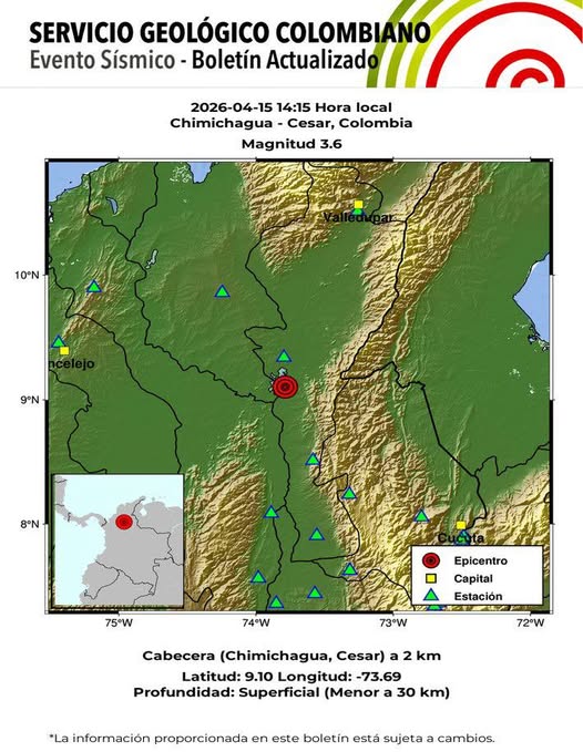 Un temblor registrado en la tarde del miercoles 15 de abril volvió a generar inquietud entre habitantes del sur del Magdalena y del Cesar, luego de que el movimiento telúrico fuera percibido en varios municipios de esta zona del país. El evento tuvo como epicentro al municipio de Chimichagua y fue reportado oficialmente por el Servicio Geológico Colombiano, entidad encargada del monitoreo sísmico nacional.